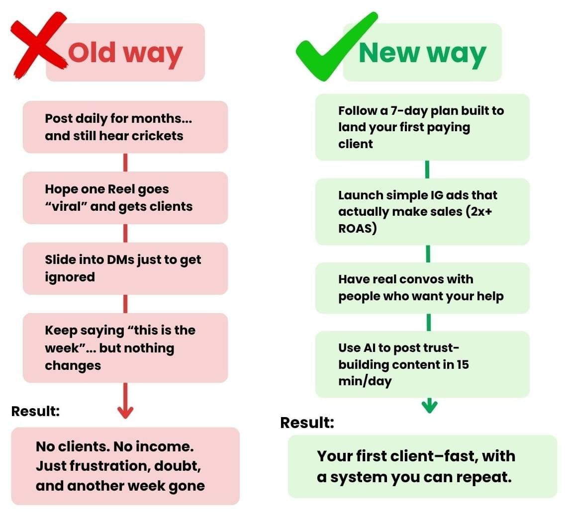 Whether you’re just starting out or stuck spinning your wheels—this gives you a clear, proven path to get your first client through IG.